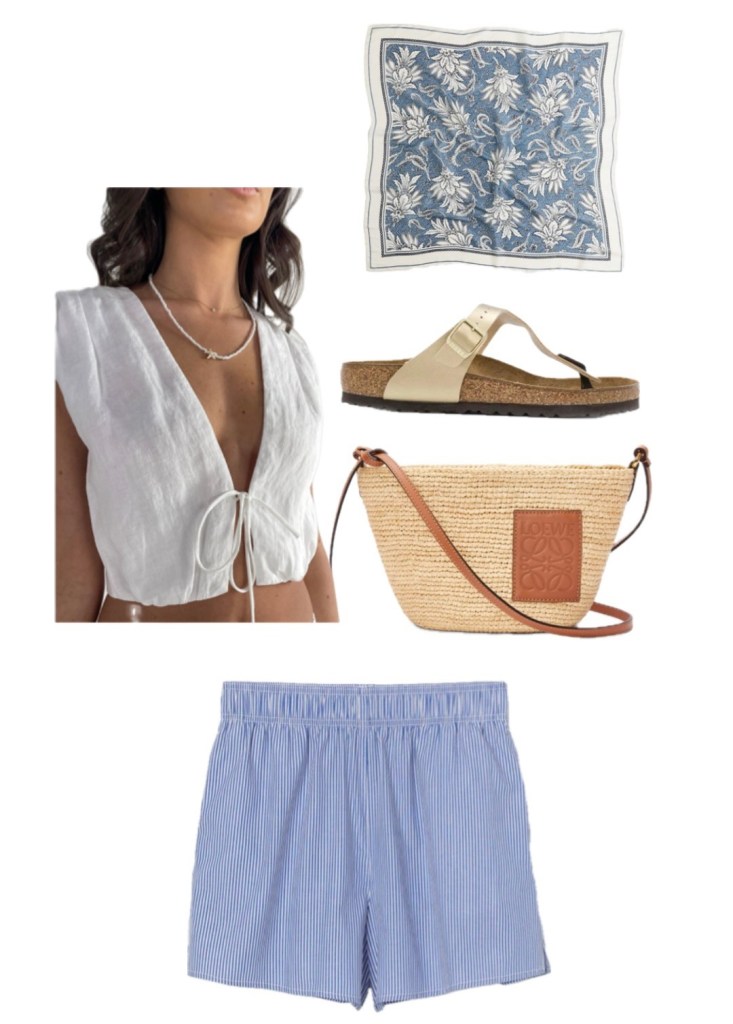Get this fit: Striped Bermudas and white cotton blouse with Loewe Slit Pochette bag accessorized with a silk scarf and beaded jewellery all set for bursting into an ABBA song in the middle of the street. And to top it all, the most iconic summer footwear of all time, sandals!