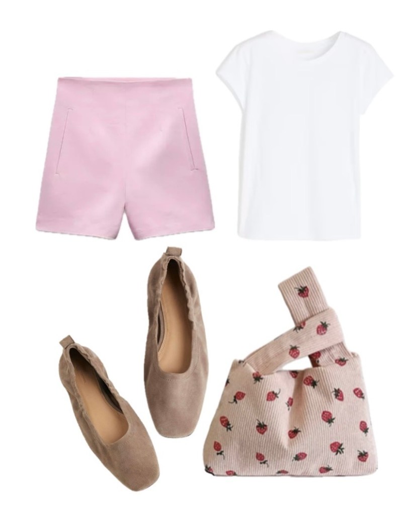 Get this fit: a cutesy pastel Bermuda with a basic tee paired with minimal jewellery, Strawberry Print Pink Corduroy Mini Tote Bag and Suede ballet pumps
