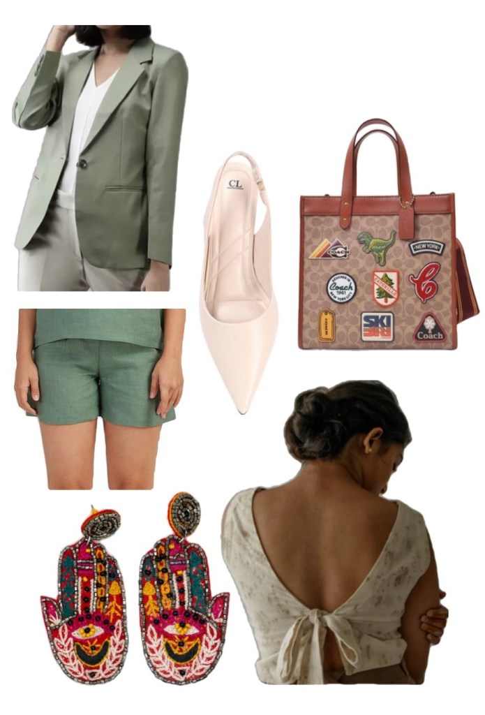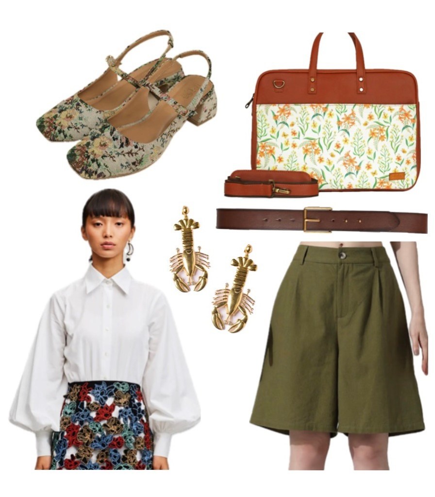 Get this fit: Bishop sleeves shirt and khaki green Bermuda brought together with a brown belt with gold accents and to go with that, Lobster gold earrings. Twiggy sun child heels and laptop bag to carry your office to the beach.