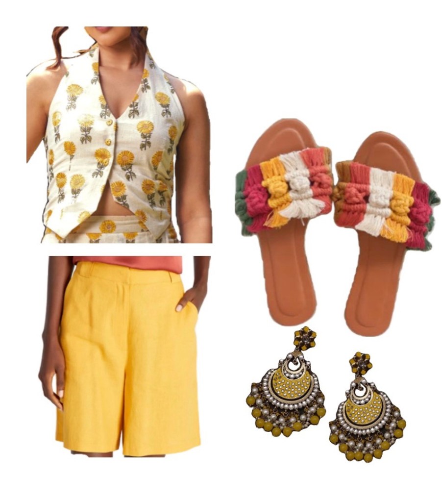 Get this fit: Off white yellow embroidered vest with yellow shorts giving off total happy vibes. Paired with macrame sandals and chaandbaalis to add to the cutesy desi look.