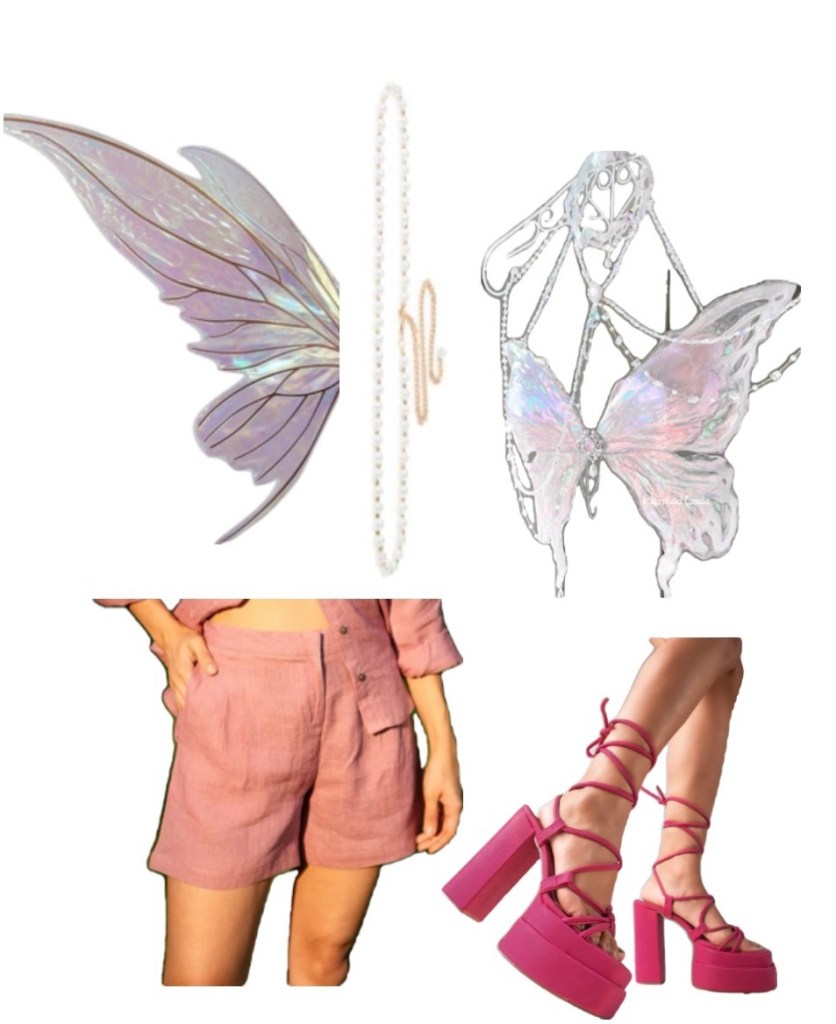 Get this fit: Pink Bermuda shorts with the trending resin butterfly top with pink lace-up platform heels and maximalist jewellery and a pearl belt.