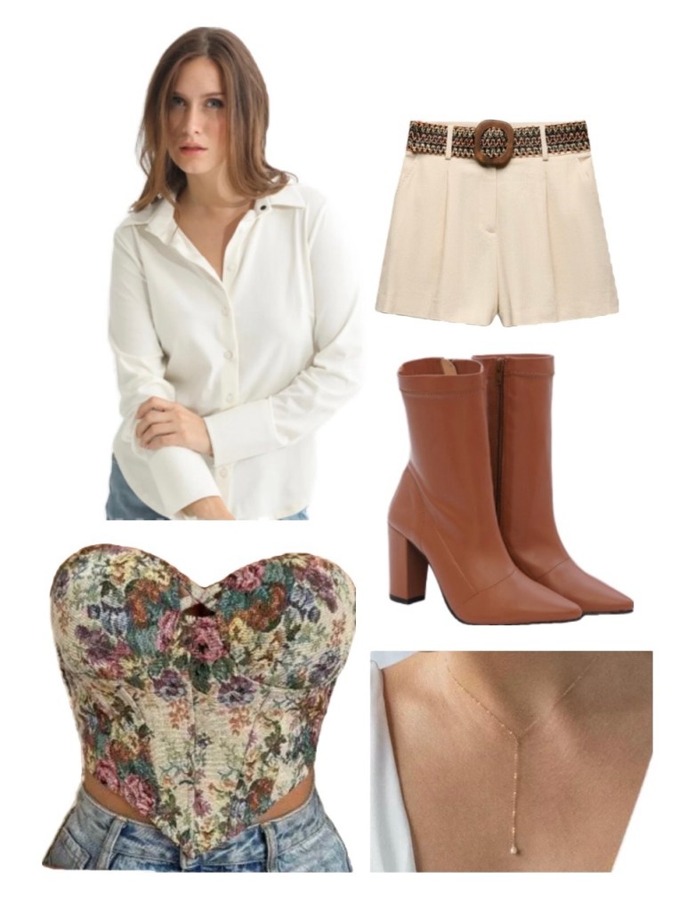 Get this fit: An embroidered corset top layered over a white shirt paired with beige belted bermuda shorts. Adding to the Pride and Prejudice vibes, pearl gold chain and brown boots.