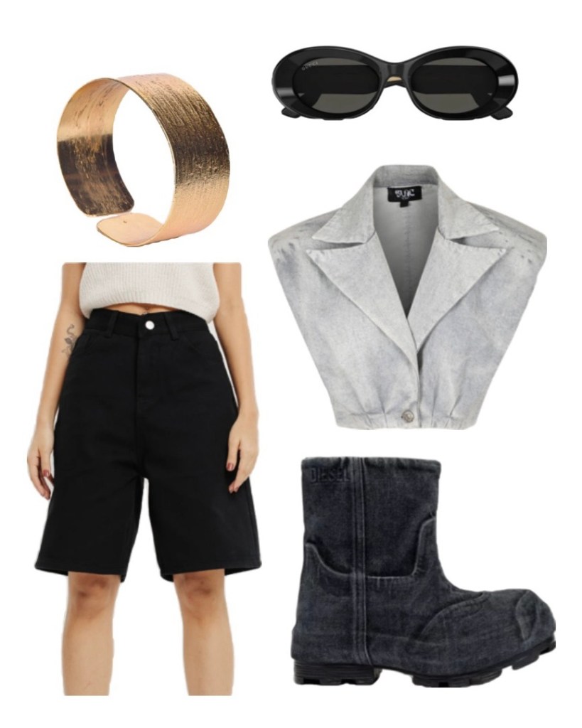 Get this fit: Black Bermuda shorts with Grey Denim Power shoulder top accessorized with a vintage vogue cuff bracelet and statement sunglasses. Diesel D-Hammer boots adds cherry on top for this fit.